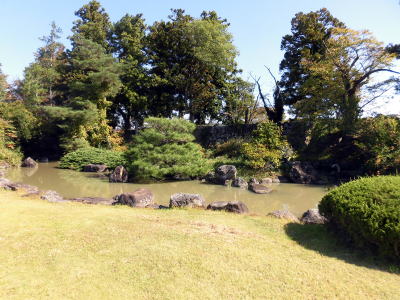 「心字の池」の背後には石垣が残る
