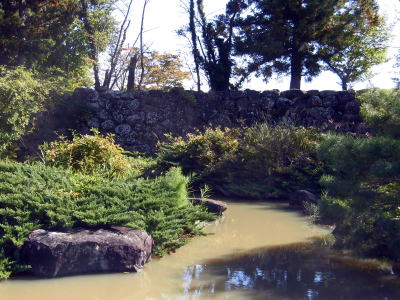 「心字の池」の背後には石垣が残る